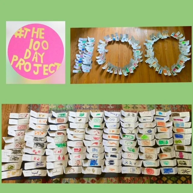 The result of this project is that I know have essentially one hundred prints and wee stories which together provide a fun, engaging way, to share a little window into my life and taught me a great deal. You can find out, for example, that I love mashed potatoes (having lived in a country where potato picking in the fall warranted a week off school!) and that gold safe wash ink mixed with a potato masher makes for great abstract art!